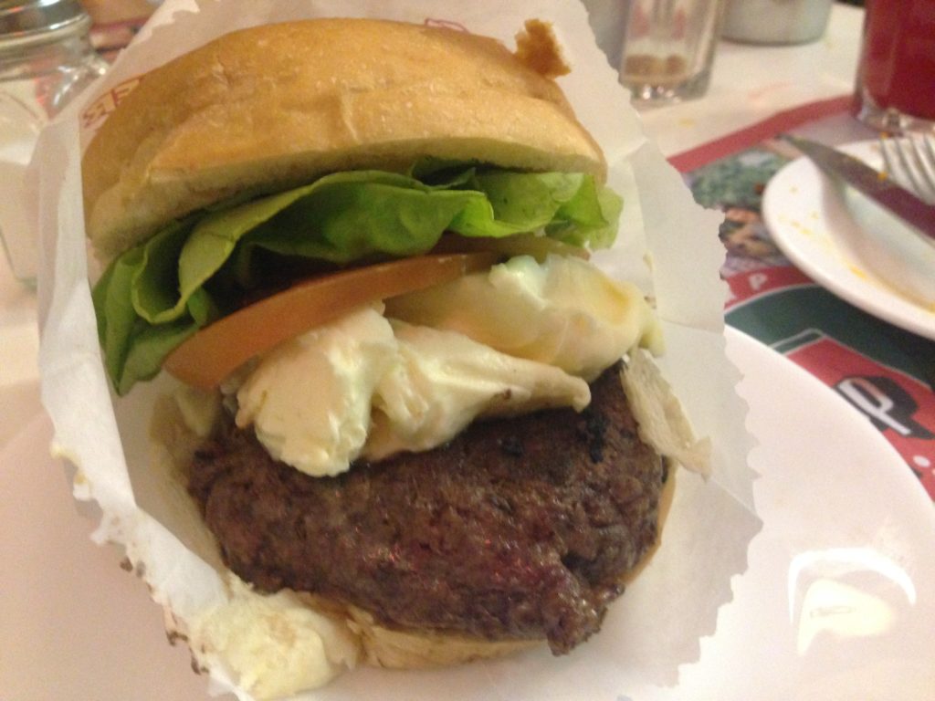 O que ela achou: Nossa! Nós comemos MUITO nesse dia. Talvez porque chegamos cheios de fome e ainda tivemos que esperar alguns minutinhos para conseguir uma mesa. Como fomos com um casal de amigos, abusamos das porções: batata de corte artesanal repleta de queijo e bacon; e pupunha assada na grelha com manteiga e sal grosso. Uma delícia! Pessoas normais parariam por aí. Mas… Pedimos os lanches.