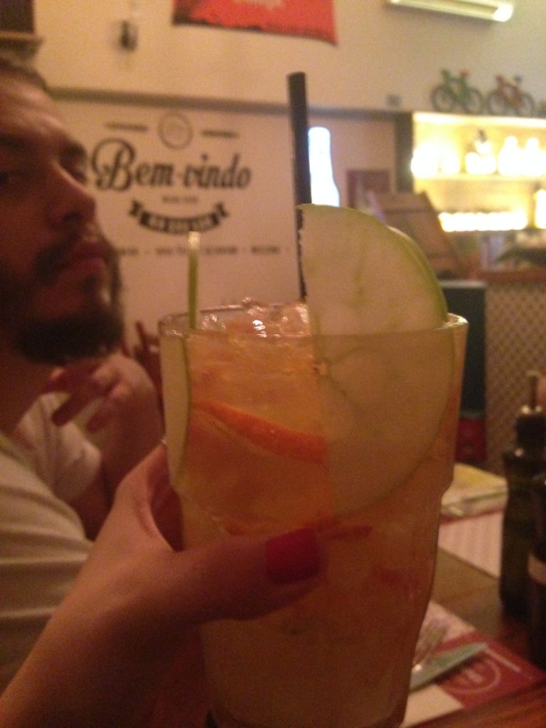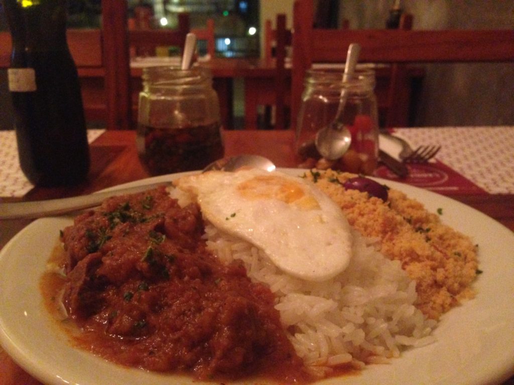O drinque que o Felipe pediu, o Caju Amigo, me impressionou por ser uma bebida feita de cachaça, mas que tinha o sabor muito gostoso para o meu paladar (Leia-se: fraca para bebidas rs). Como os croquetes são bem-servidos, dividimos um prato principal: o picadinho. Que comida saborosa! Arroz soltinho, carne molinha e pimenta em conserva para completar. O ovo deixei para o Felipe. :p