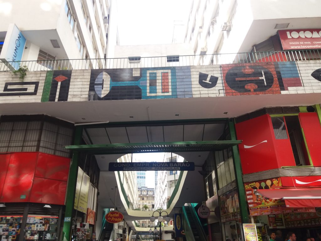Essa é a que está na disputa com a Galeria Metrópole pela nossa preferência. Não andamos nem 20 metros da Galeria Sete de Abril para estar na frente do portal para a Galeria Nova Barão. Logo na entrada já nos deparamos com cultura na parte superior da entrada, onde há uma obra do artista italiano Bramante Buffoni.