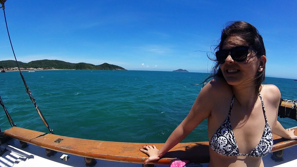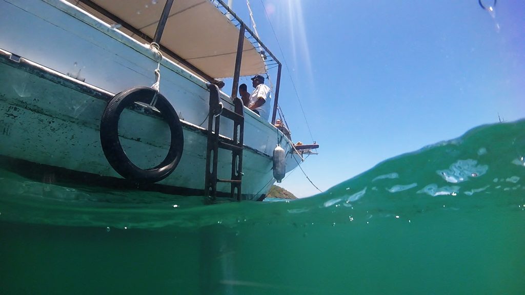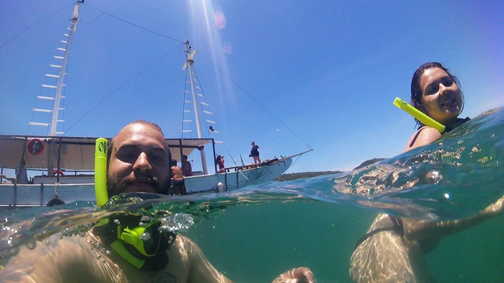 Na volta, ficamos esperando o passeio de escuna (R$ 50 por pessoa) agendado para às 11h30. Demos muita sorte nesse dia, pois só tinham 15 pessoas no barco, então foi bem tranquilo, sem muito auê. Esse passeio já contempla a região norte da península com três paradas para mergulho. Adoramos passeios de barco por conta disso, eles param em uma área tranquila para mergulhar, coisa que não faríamos se estivéssemos na areia.