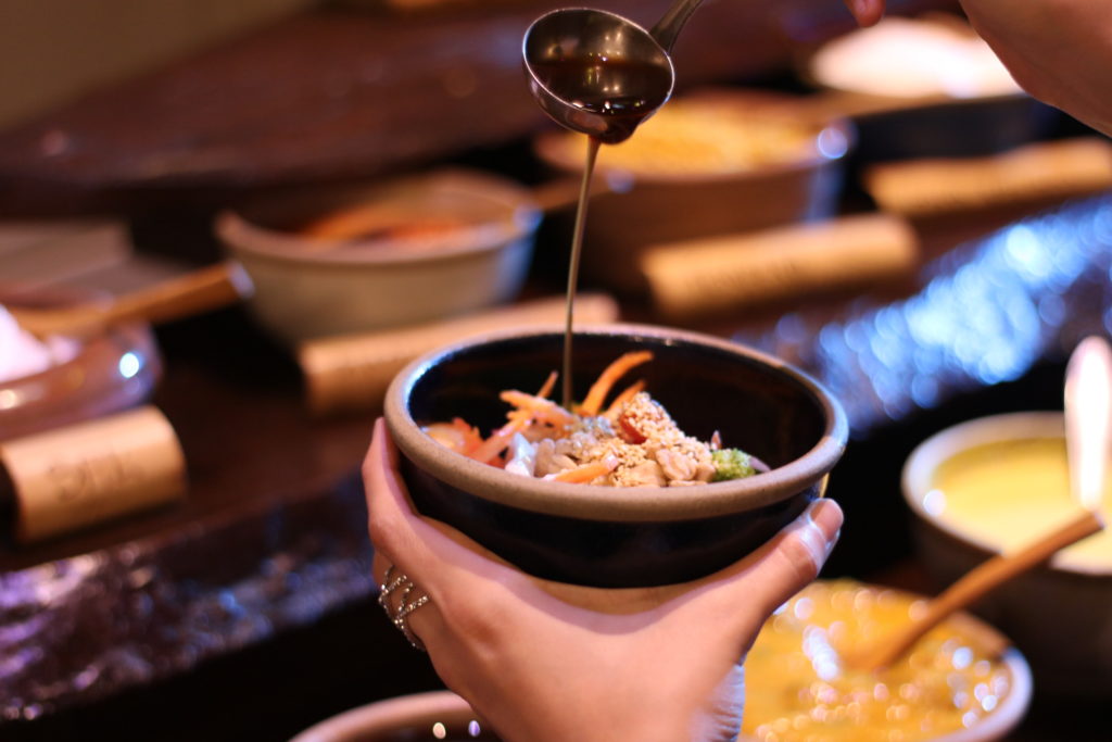 Nossa opção para prato principal, foi a mais pedida do local: o Mongolian Grill (R$ 78,90 no jantar). Nós mesmos montamos a comida em um bowl e depois entregamos para o chapeiro e ele prepara sua mistura numa grande chapa de ferro!