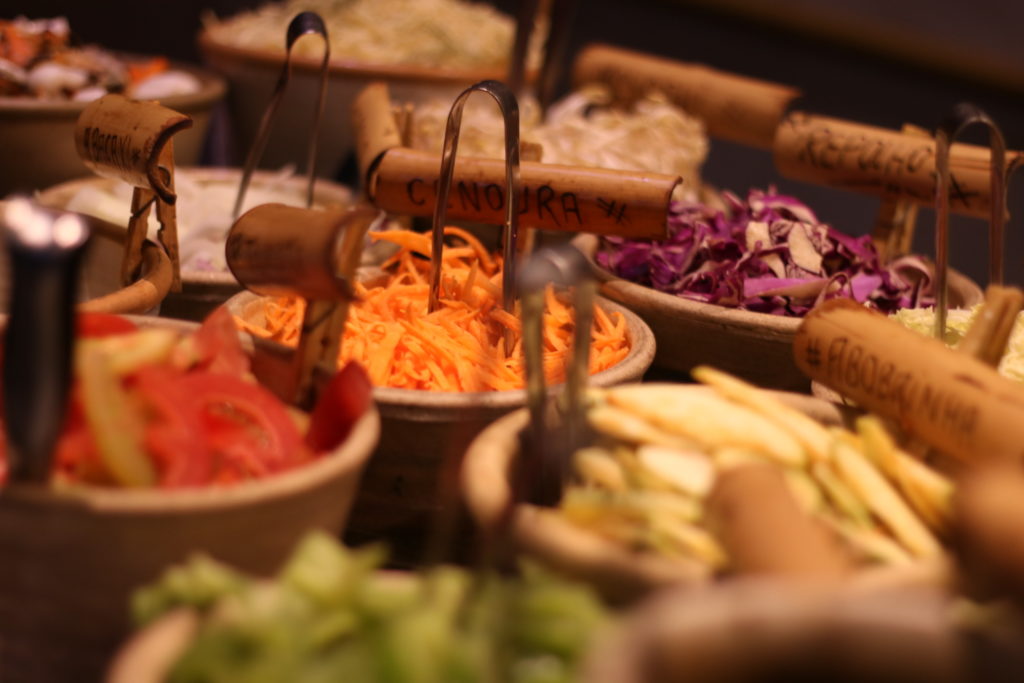 Primeiro você escolhe sua carne: tem frango, Saint Peter, contra-filé, e até as mais exóticas, como tubarão e javali. A recomendação do restaurante é que não misture os tipos de carne, para cada receita é melhor escolher apenas uma das opções. Depois disso você escolhe os legumes, temperos, ervas, condimentos e molhos. São MUITAS opções.