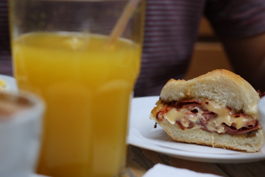 O Fe pediu também um sanduíche Mercadão + Queijo (R$ 16,80) e eu uma Salada de Frutas (R$ 9,90). Claro que não consegui seguir a dieta e acabei pedindo um Cappuccino tradicional (R$ 5,90), já o Fe foi de Suco de Laranja (R$ 7,90).