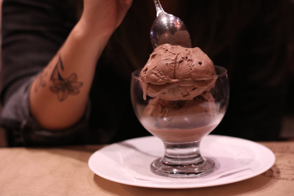 De sobremesa, a Bruna pediu um gelato de chocolate e eu fui de palha italiana. Claro que pedimos para embrulhar o que havia sobrado da pizza, como também um pedaço do pão – isso nos deixa muito felizes. hahaha