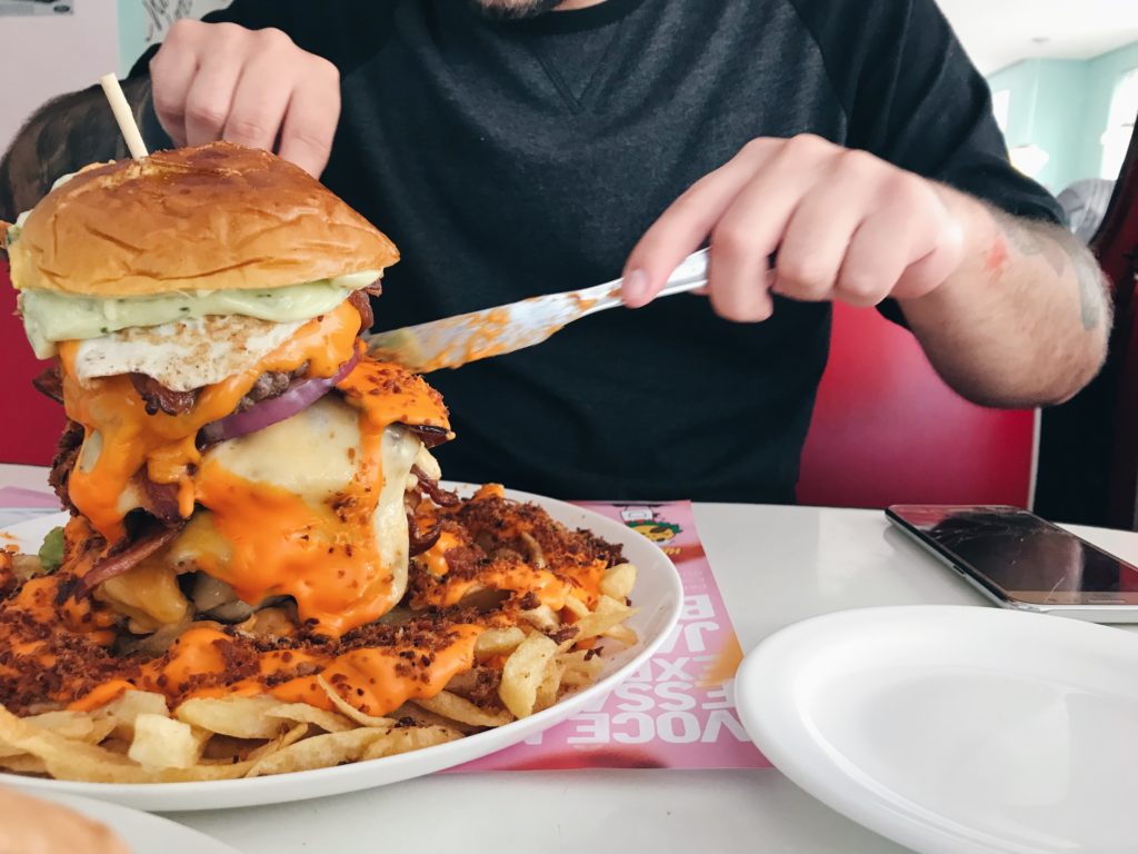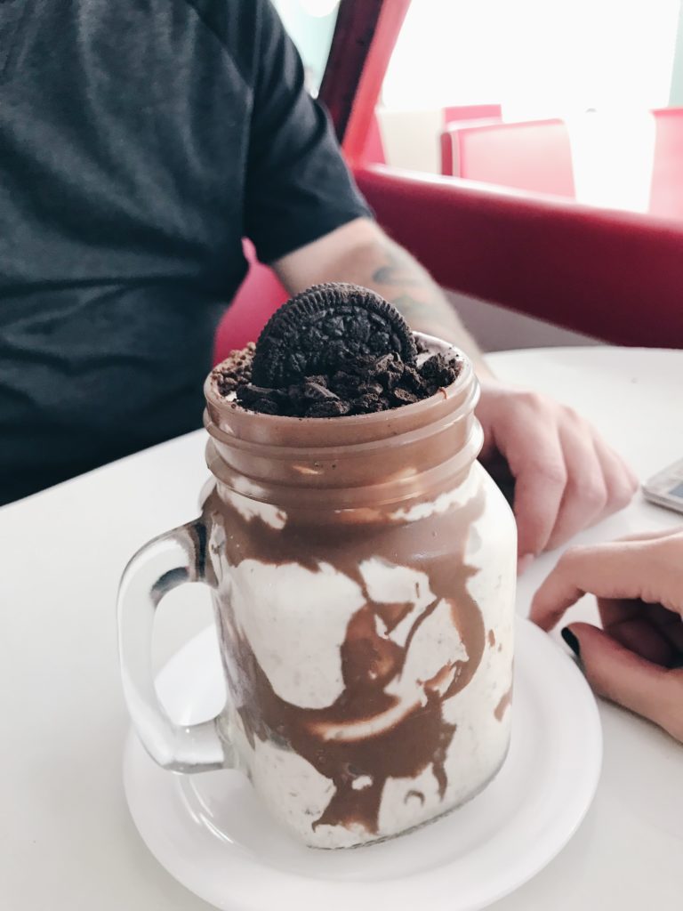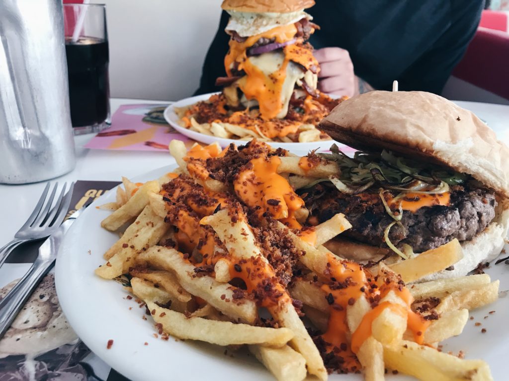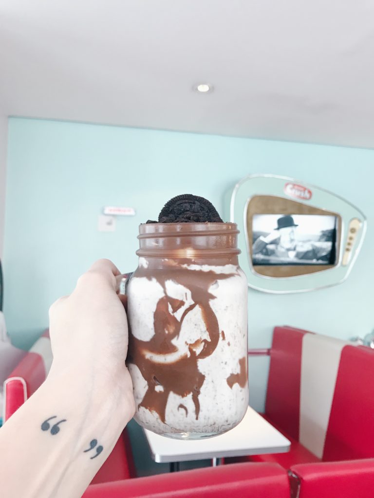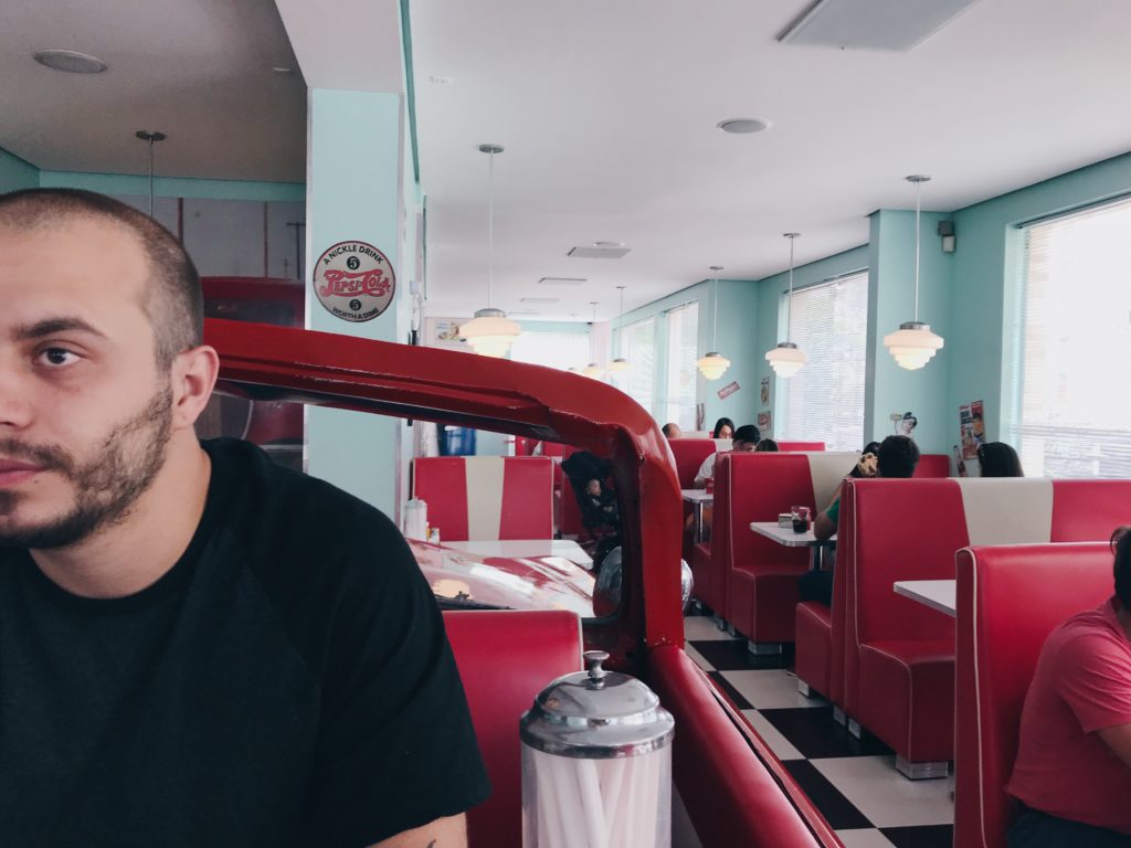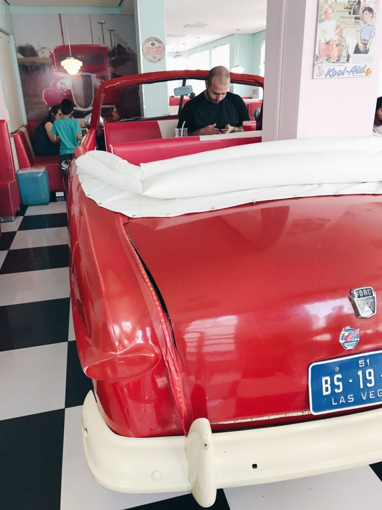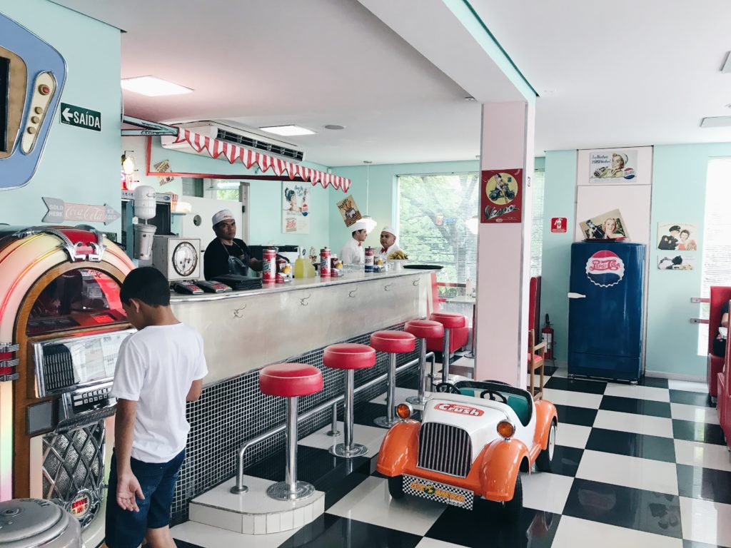 Já falamos da Zé do Hambúrguer aqui, em 2015. Eis que voltamos, depois de dois anos, e muita coisa nova entrou no cardápio da lanchonete desde então. Desta vez, tivemos a chance de sentar na famosa mesa dentro de um carro, um Ford 51 – uma clara referência ao clássico filme Pulp Fiction. Para quem nos acompanha no Instagram, viu nos nossos stories como parecíamos duas crianças felizes dentro do carro. hahahaA hamburgueria é toda ambientada com a temática dos anos 50. Músicas da época embalam os clientes no ritmo dos Anos Dourados. E é bem comum vermos pessoas mais velhas se empolgarem com as canções enquanto escolhem ou esperam por seus pedidos. Confesso que nós também ficamos cantando.
