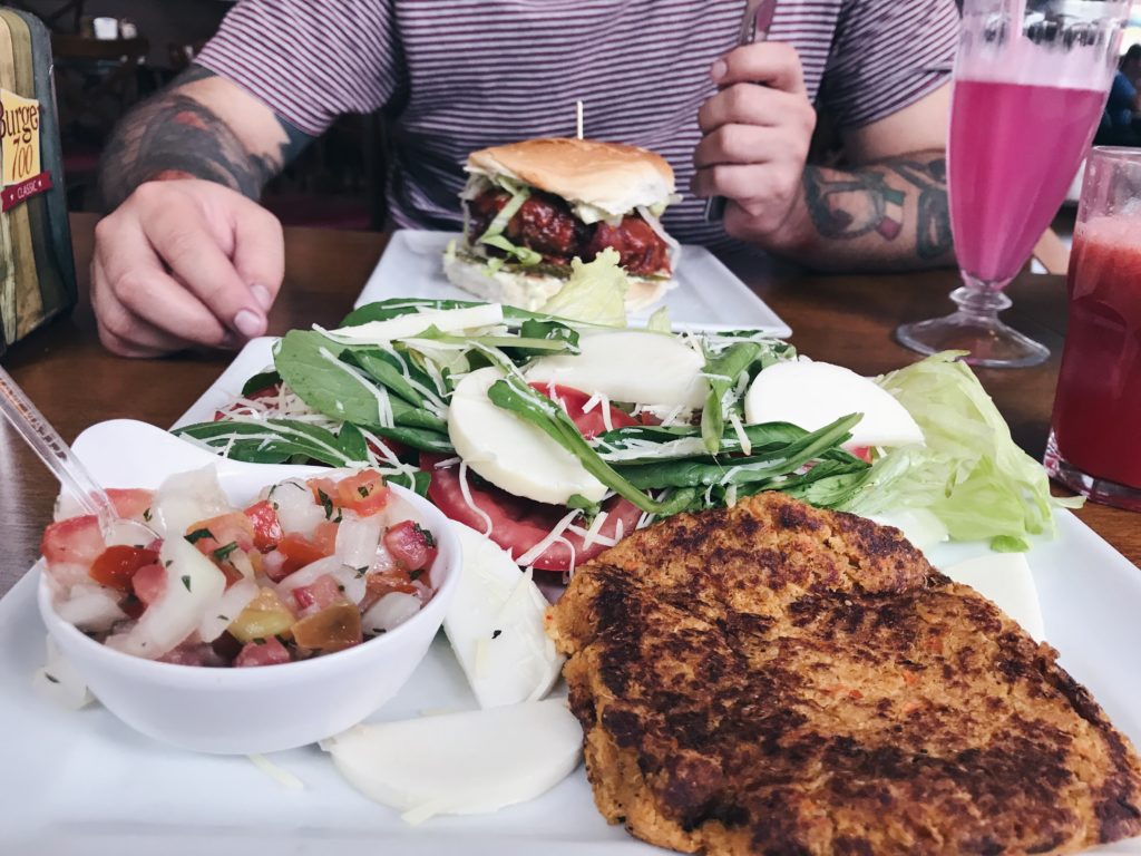 O prato da Bruna é ideal para quem está em fase de reeducação alimentar, tem alguma restrição ou por escolha mesmo. O hambúrguer tem 110g e é feito com alho poró, pimentão, salsão, cenoura, proteína de soja e quinoa, acompanhado da Salada Mista (alface americana, rúcula, tomate, palmito e parmesão).