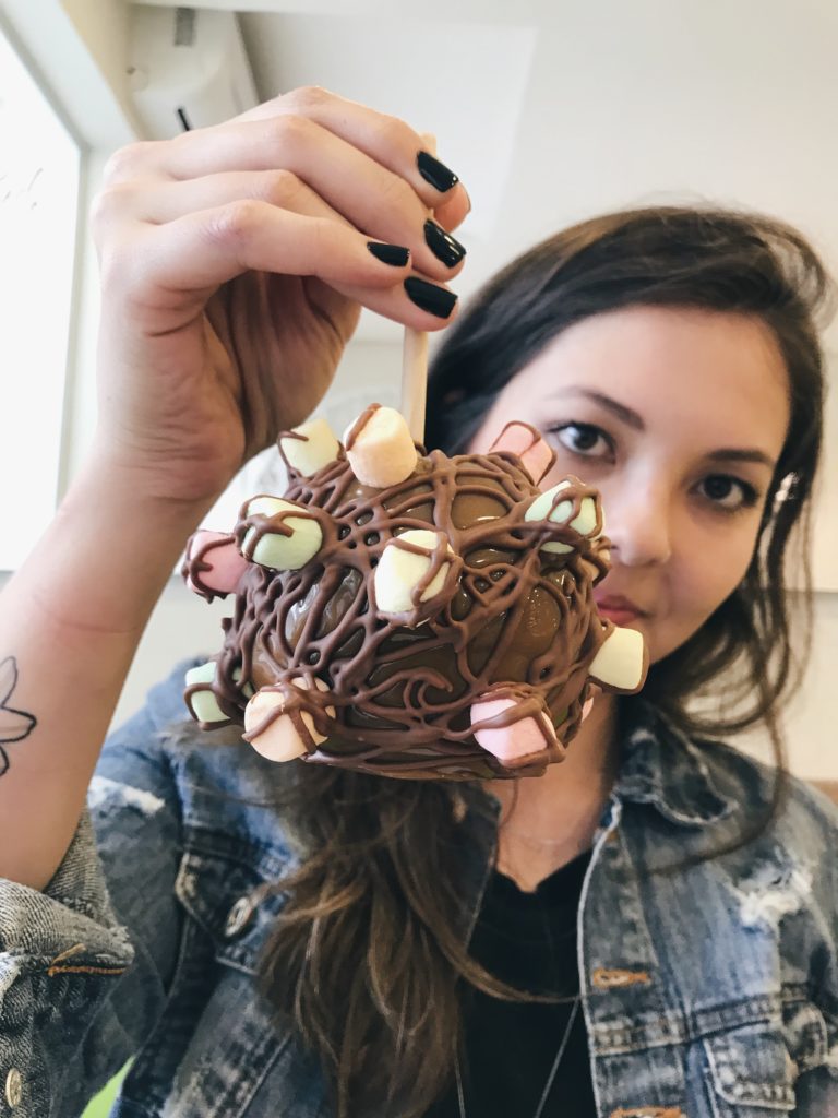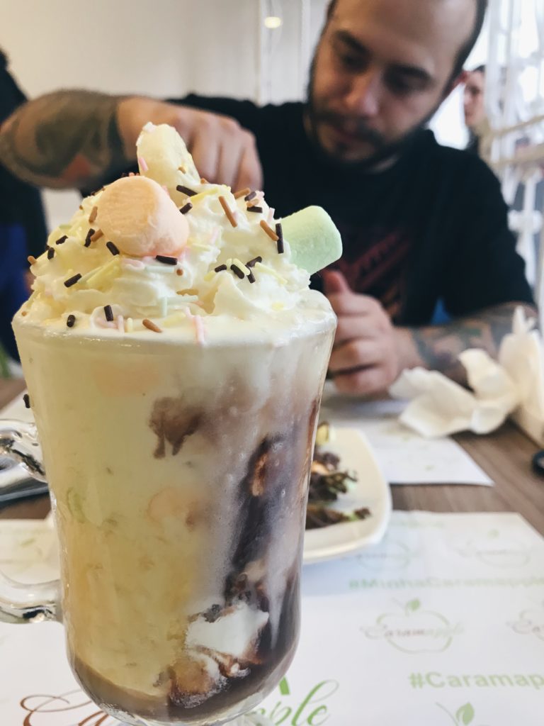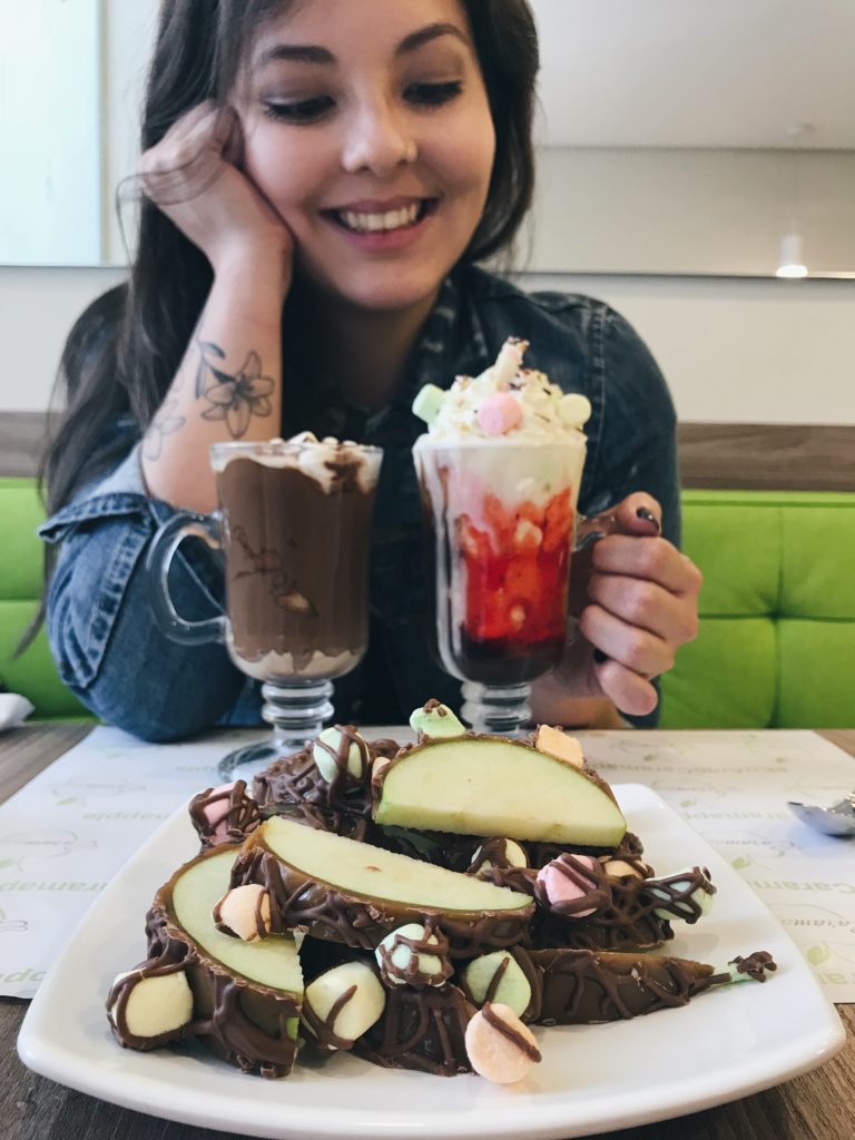 “Mas o que tem de tão legal assim?”. Vamos lá: a Caramapple é um lugar especializado em maçãs carameladas com uma infinidade de coberturas deliciosas. É como se fosse uma prima da maçã do amor – que é uma coisa que, mesmo comendo pouco, eu gosto bastante; já a Bruna não é muito chegada por achar muito dura e doce demais.