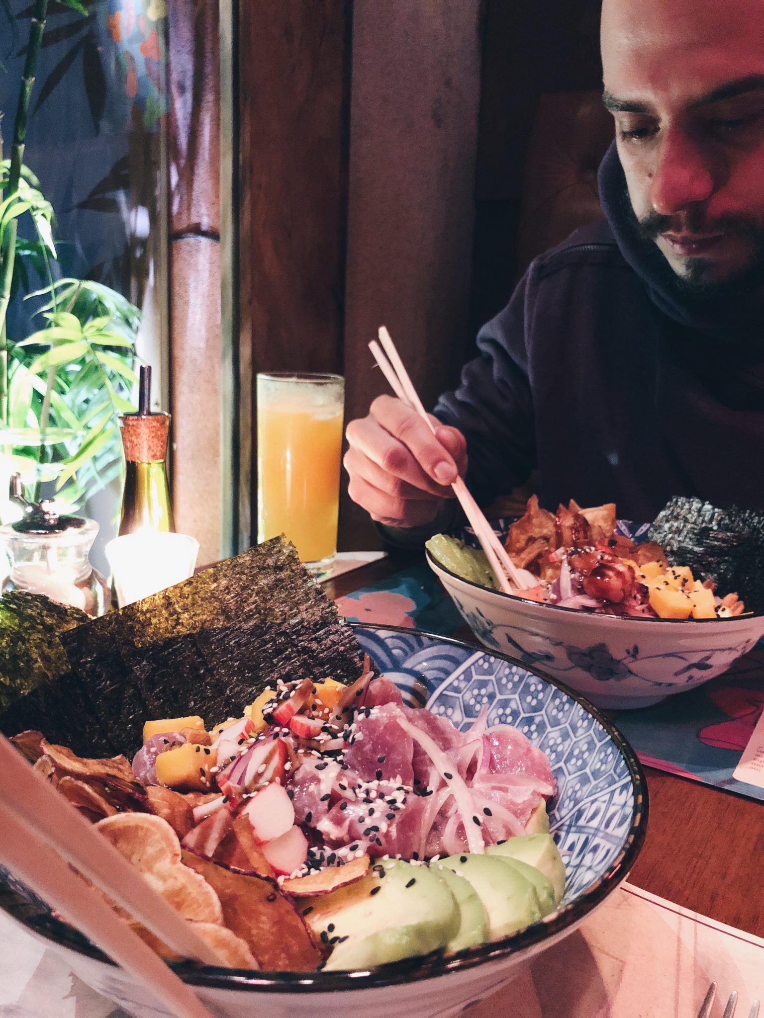 Poke é um prato típico havaiano criado por pescadores nos anos 60, que chegavam com peixes de suas pescarias, os cortavam de forma rústica, temperavam e comiam com arroz. Aos poucos foram adicionando mais ingredientes ao prato.