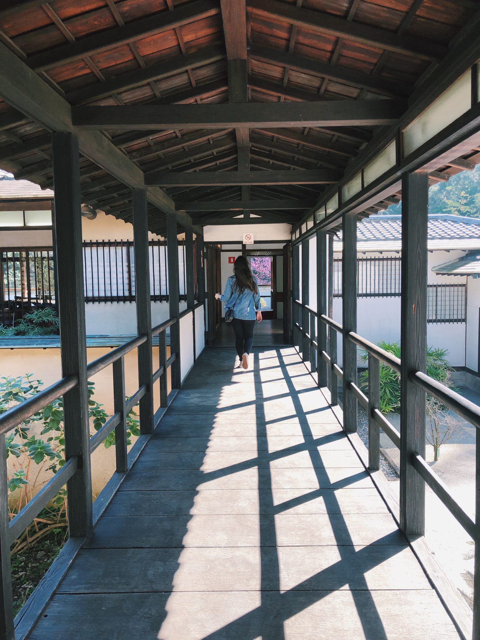 Felipe pirou nos jardins. As pequenas árvores – chamadas de Bonsai – e grandes pedras deixam a área externa a coisa mais linda de se ver. Cada espécie de planta tem uma plaquinha com nome e origem, ficamos encantados pelo Pinheiro Negro. No jardim zen que tem aquela areia branca, sabe? Em volta de algumas plantas há desenhos e o mais incrível é não ver pegadas por ali e ficamos pensando como eles conseguem arrumar depois.