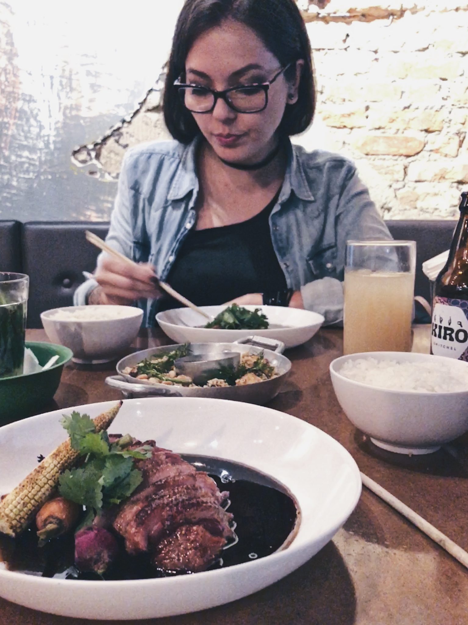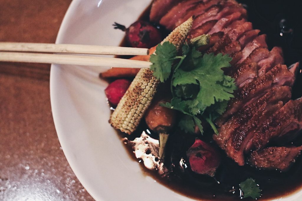 Foi muito difícil escolher um prato. Primeiro porque há muitas opções que fazem nosso psicológico imaginar a maravilha que é. E também porque optamos por escolher pratos que provavelmente permanecerão no cardápio de Primavera. No caso do Felipe, ele escolheu o Vit Khoi (R$ 56), um magret de pato defumado e caramelo de anis, vem com minilegumes que dão um charme a mais para o prato.