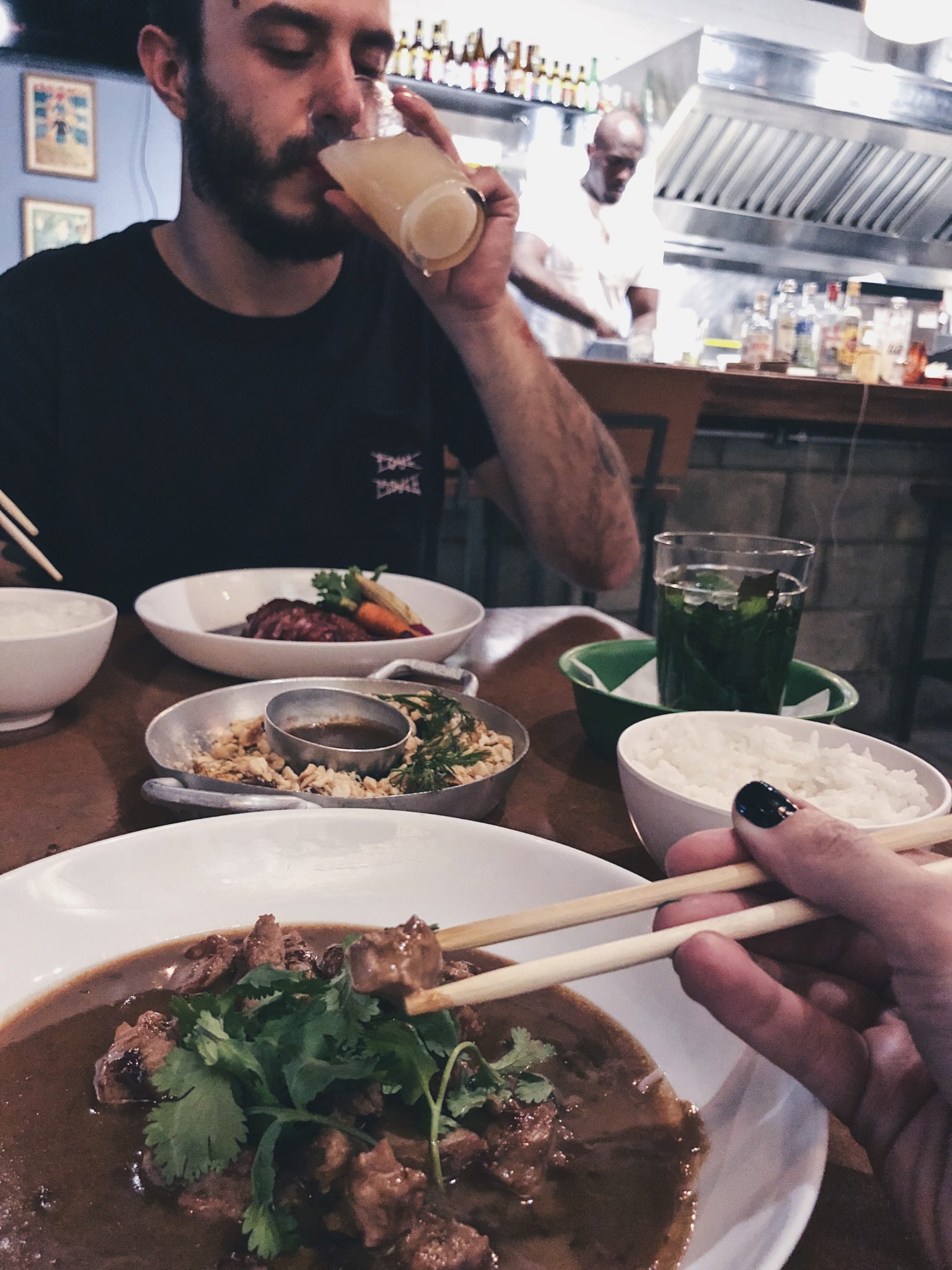 Eu estava com muita dúvida e tinha me interessado por um salada, mas também não queria dispensar o carro-chefe da casa. Não sou fã de carne de porco e o Thit Kho To (R$ 37) é um picadinho de filé mignon suíno com molho de leite de coco queimado muito queridinho dos frequentadores. A Natasha disse que eu não me arrependeria, confiei nela. Ainda bem! A carne do porco é caramelizada, então há um contraste do doce com o salgado muito saboroso. Já o molho, minha nossa, que molho! Joguei todo o arroz que eu tinha para aproveitar o que sobrou no prato e não desperdiçar nada. rs De palitinho mesmo.