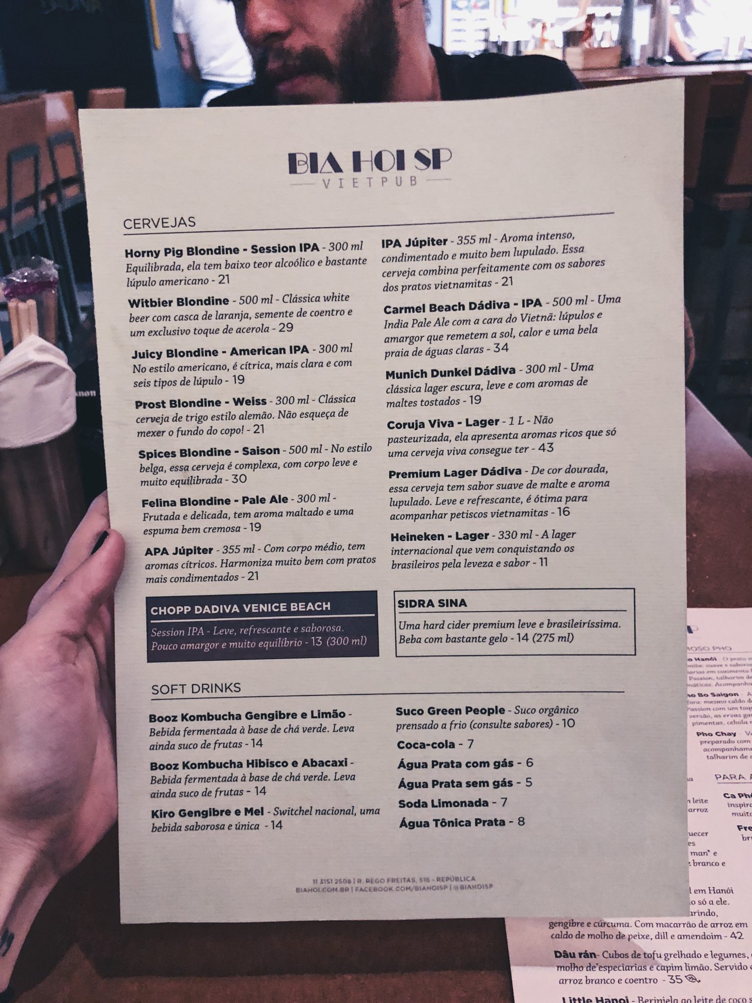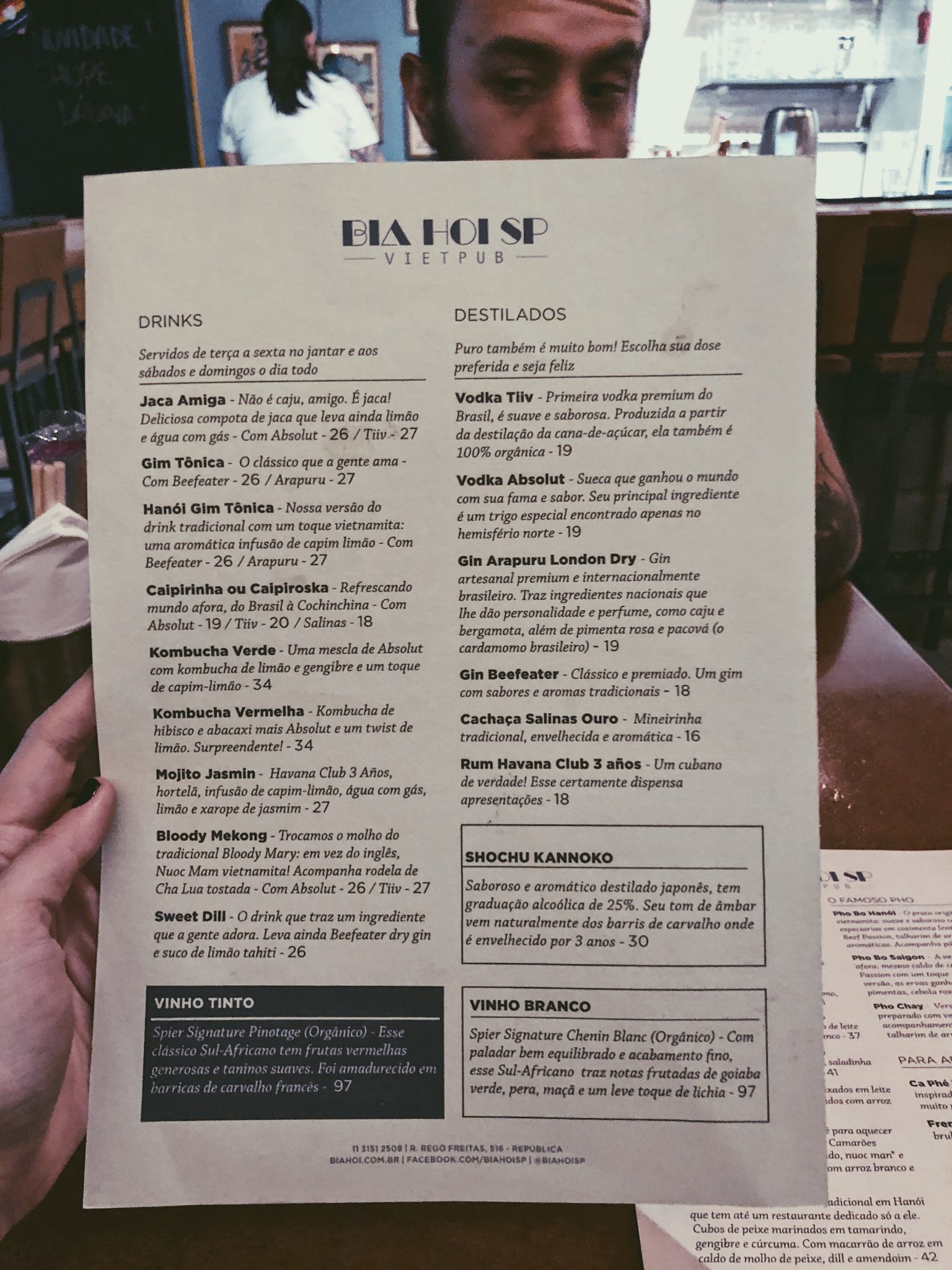 Felipe quis experimentar duas bebidas bem diferentes do cardápio. A primeira, sem álcool, é a Kiro Gengibre e Mel (R$ 14), é um switchel (uma bebida feita de água misturada com vinagre) cuja origem não se sabe ao certo, porém tornou-se popular entre os agricultores norte americanos por ser altamente refrescante e um isotônico natural. Tem apenas 4 ingredientes: gengibre, mel, vinagre de maçã e água. E tem um sabor muito complexo. Houve um debate entre o Felipe e eu, ele sentia muito o cheiro e sabor do vinagre, já eu sentia apenas o gosto doce do mel e a leve picancia do gengibre. Depois descobrimos que esse debate é supercomum por lá. rs A benida é refrescante e ao mesmo tempo aromática! Combina muito com as comidas do vietpub. Essa marca Kiro é nacional (olha que bacana!) , é produzida artesanalmente e com ingredientes orgânicos. Agora já tenho uma nova dúvida no cardápio de drinques nos resturantes: switchel, chá ou suco? rs