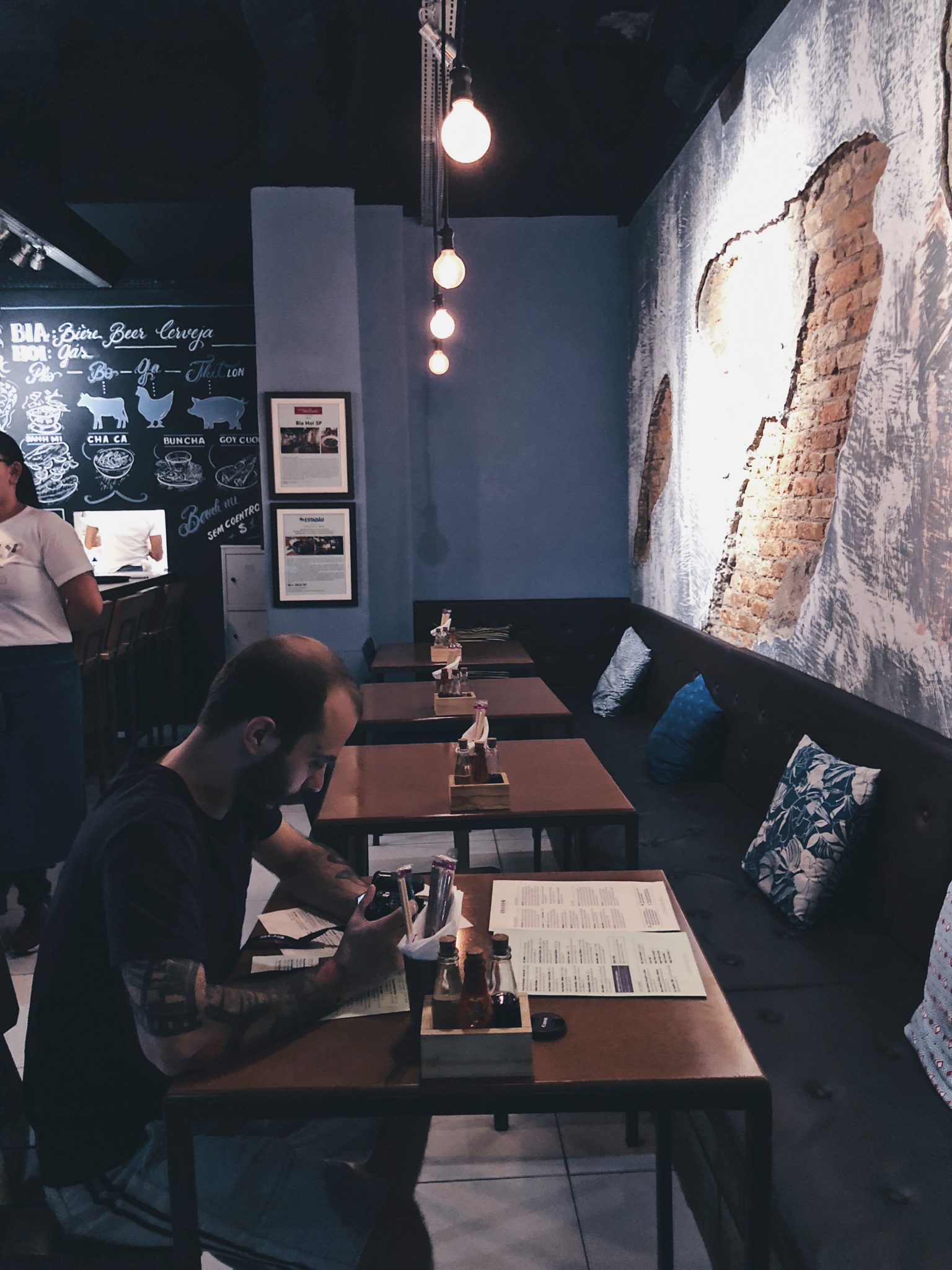 Visto de fora, o Bia Hoi SP é daqueles lugares que você olha e pensa: “Que gostoso!”. As luzes são confortáveis e o ambiente pequeno te dão a sensação de acolhimento. Mesmo com as mesas bem próximas uma das outras, conseguíamos conversar tranquilamente. Parte da movimentação da cozinha é visível, e as bebidas são feitas ali mesmo, no balcão.