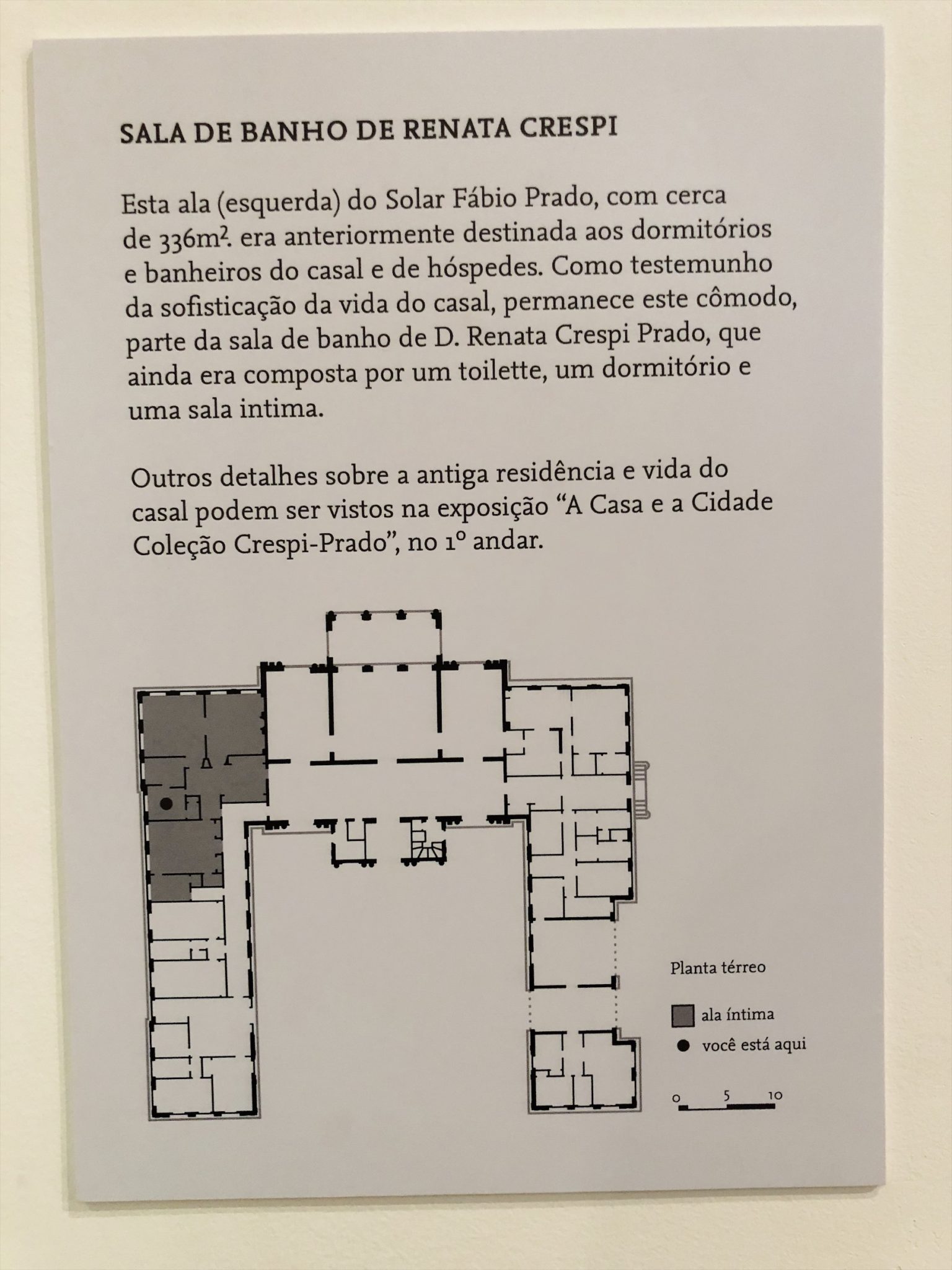 A parte que mais gostamos foi ver a Sala de Banho de Renata Crespi preservada, que ficava numa área denominada “ala íntima” do solar.
