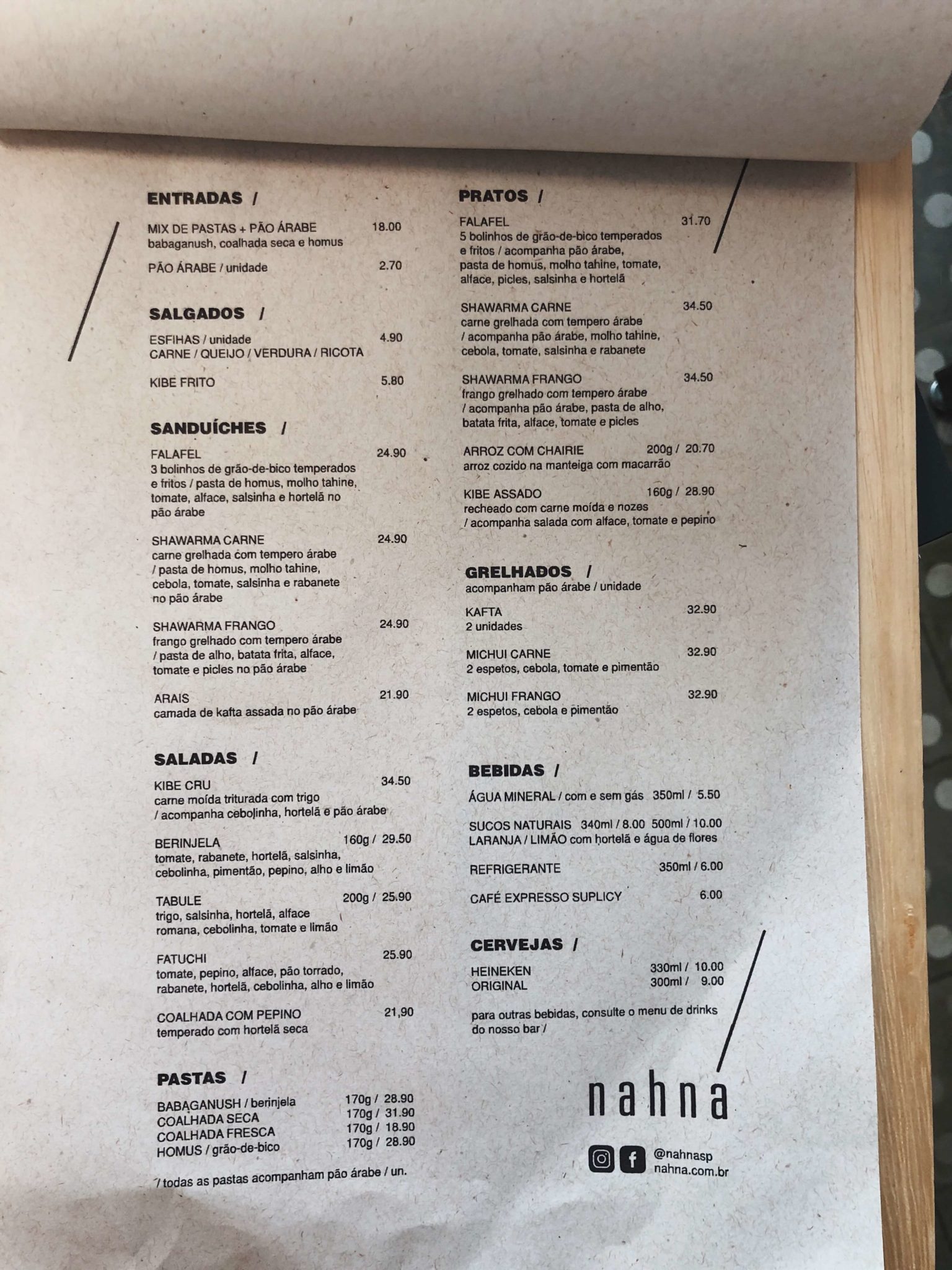 Embora São Paulo tenha uma diversidade imensurável de restaurantes, nosso paladar ainda é um tiquinho leigo no quesito comida árabe, acabamos por nos limitar a pensar que a culinária seja apenas sobre esfihas, kibes e pastas. O menu do Nahná – que muda a cada 4 meses – prova que temos muito o que aprender ainda sobre essa gastronomia. Começando pelos pratos que estavam disponíveis no menu de sábado, como eu já tinha certeza do que eu ia provar, Sônia explicou alguns deles para nós; um, inclusive, é receita de sua sogra. Dá uma olhada no cardápio: