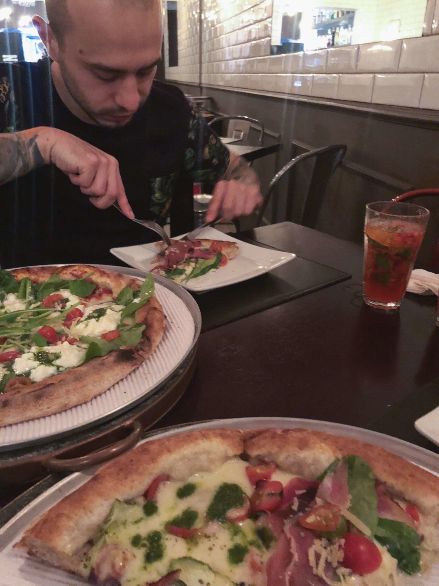 O menu de opções de pizza é bem enxuto, mas nem por isso a missão para escolher um sabor seja fácil! Levamos um tempo considerável para pedir duas brotinhos – que de pequenas só tem o nome, elas são bem grandes! Enfim pedimos duas: uma meia Parma e Rúcula (R$52) que vai mozzarella, tomate sweet, manjericão, rúcula, presunto parma e parmesão e meia de Zucchine (R$42) abobrinha, mozzarella, manjericão, tomate sweet, fatias finíssimas de bacon e pesto genovese e outra inteira de Burrata (R$49) molho de tomate, manjericão, parmesão, tomate sweet, burrata de búfala rasgada, rúcula, pesto genovese, lascas de parmesão e mozzarella.